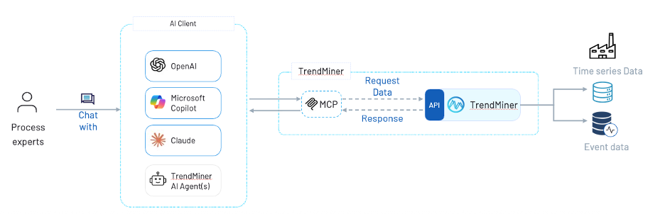 That consistency is what makes it a foundation rather than a feature. As shown in the architecture above, a process expert working in their organization's approved LLM platform, whether that is OpenAI, Microsoft Copilot, Claude, or a purpose-built TrendMiner agent, connects through a single MCP layer to TrendMiner's API, which generates insights from its contextualized data layer on top of the raw time-series and event data. The organization does not need to choose between their enterprise AI investment and purpose-built industrial analytics. The two work together, within the client the engineer already uses.