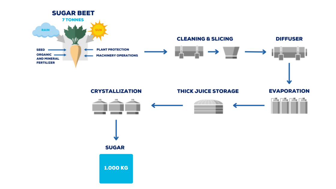 In the sweet world of sugar production, the heart of the operation beats within the crystallization vessels. The journey to crystalized sugar starts by cutting sugar beets and soaking them in hot water inside the diffusion towers. Next, vacuum and heating processes remove most of the water. This results in a syrup. Finally, the crystals form when the syrup is cooled again and returned to normal pressure.
